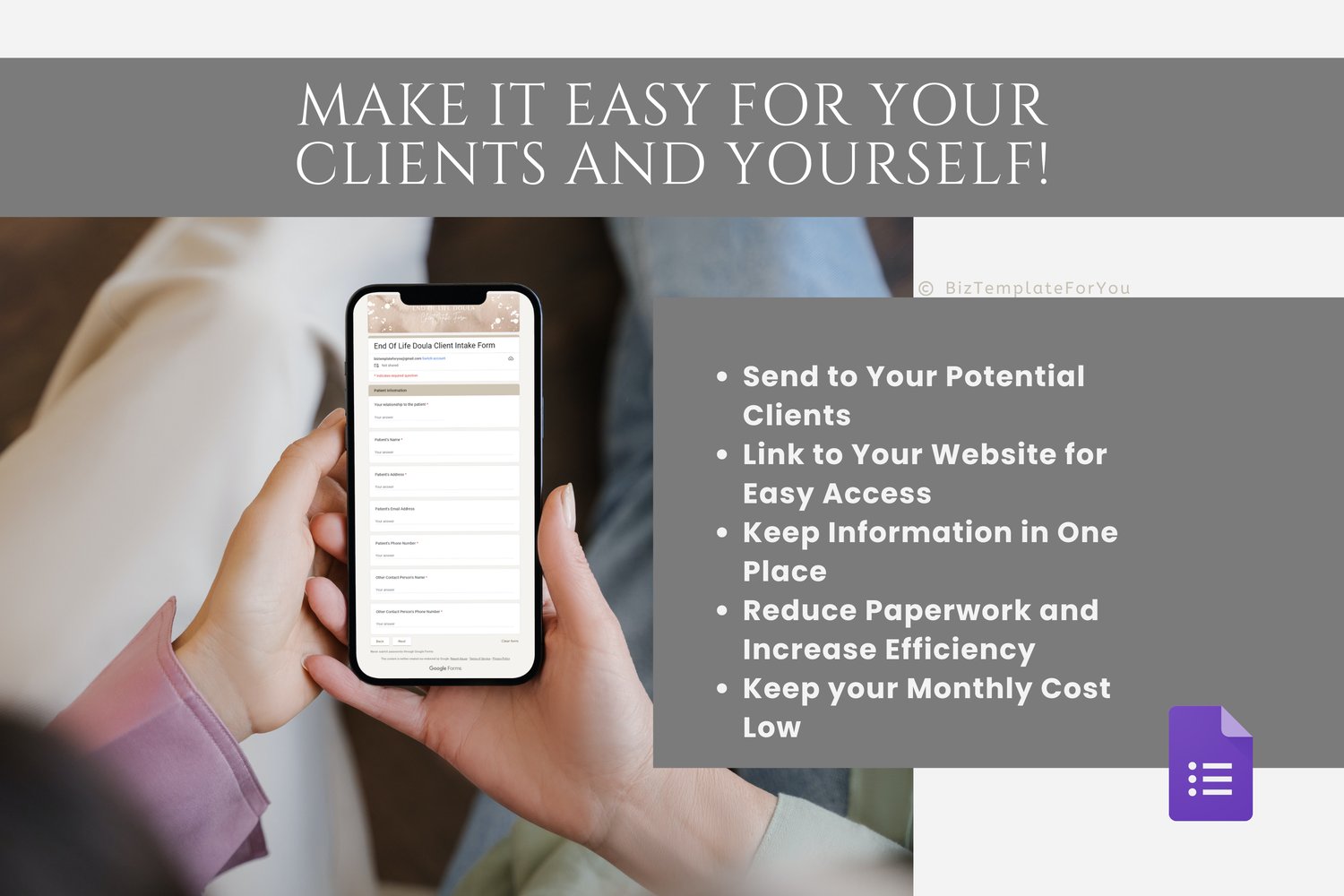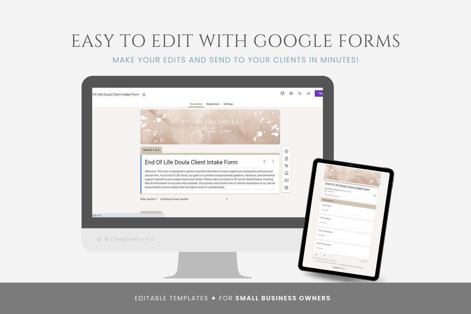 This is an End-of-Life Doula Client Intake Form Template editable in Google Forms! The text is already written for you, but it can also be easily edited in Google Forms to add anything particular to your business or area. It is also completely customizable. Text, font, and colors are all fully editable to give you complete control of your branding and create a cohesive look for your business.