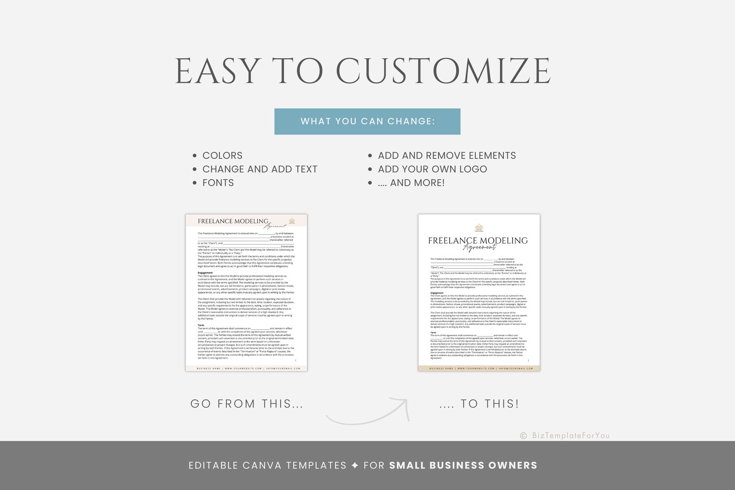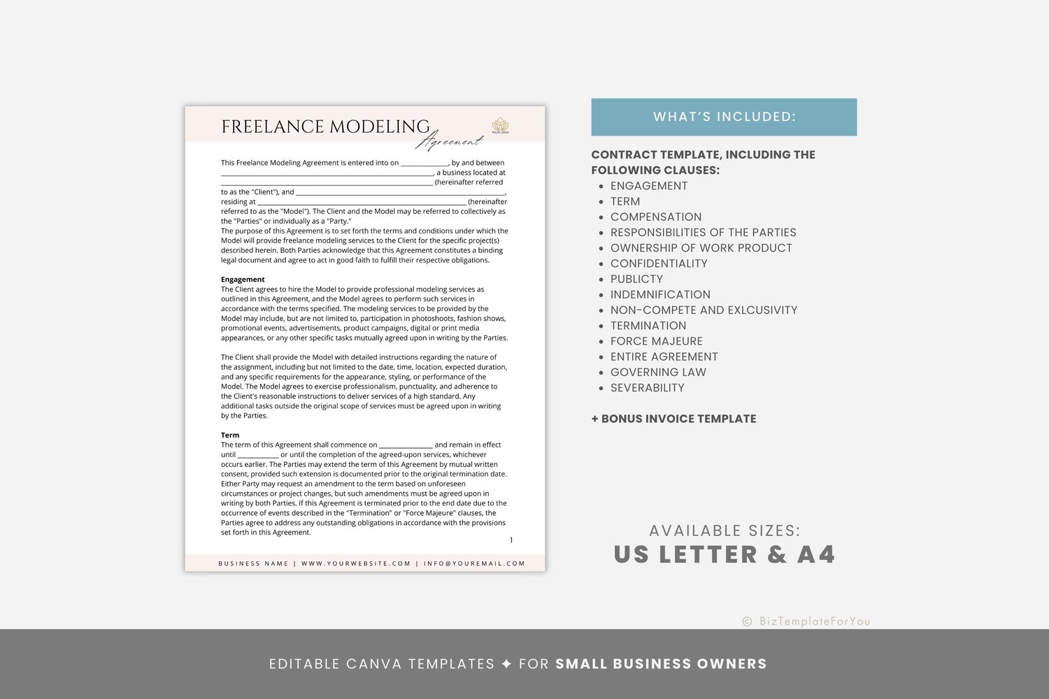 This is a 6-page Freelance Modeling Agreement Template editable in Canva (FREE Account)! The text is already written for you, but it is also easily edited in CANVA to add anything that is particular to your business or area. It is also completely customizable. Text, font, and colors are all fully editable to give you complete control of your branding and create a cohesive look for your business.