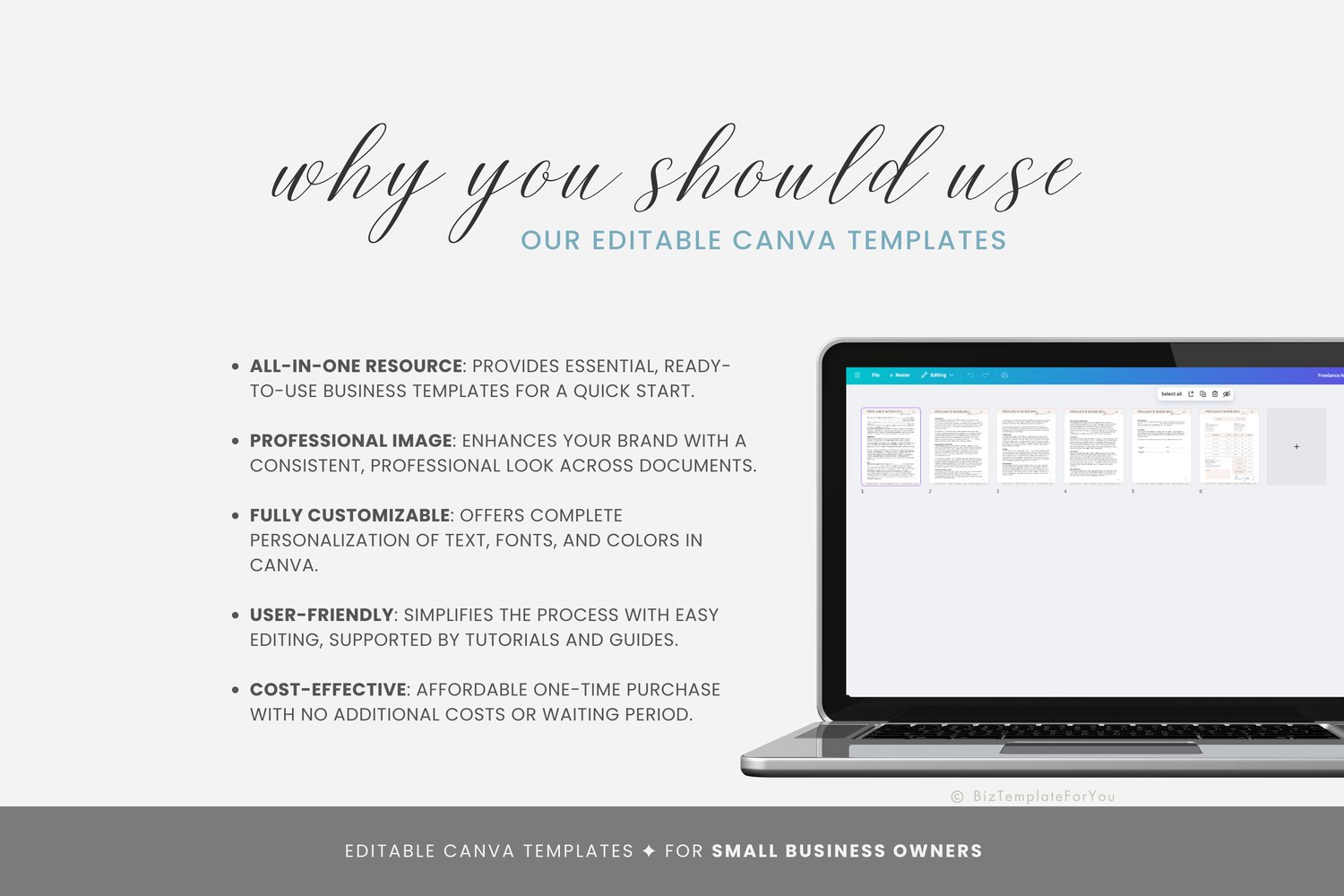 + All elements of our templates are FREE. BizTemplateForYou bears no responsibility for situations wherein the client utilizes PRO elements within Canva, resulting in charges incurred by Canva.
